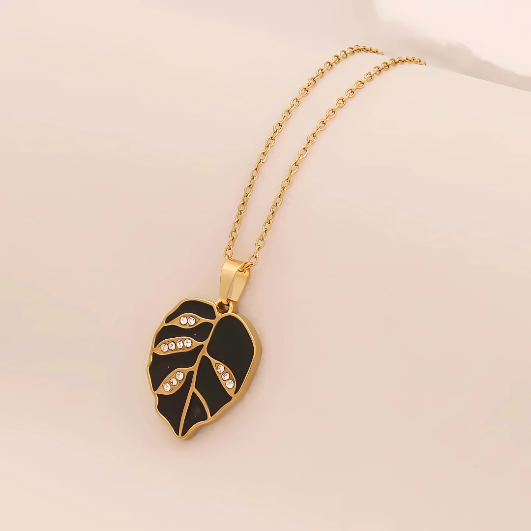 Add a touch of sparkle to your look with the Aurea Black Necklace. Crafted from durable stainless steel, its sleek black leaf pendant shines beautifully, accented by dazzling rhinestone details that catch every eye. This playful blend of gold tones and shimmering stones makes it the perfect accessory to brighten up any outfit with a hint of nature-inspired charm.