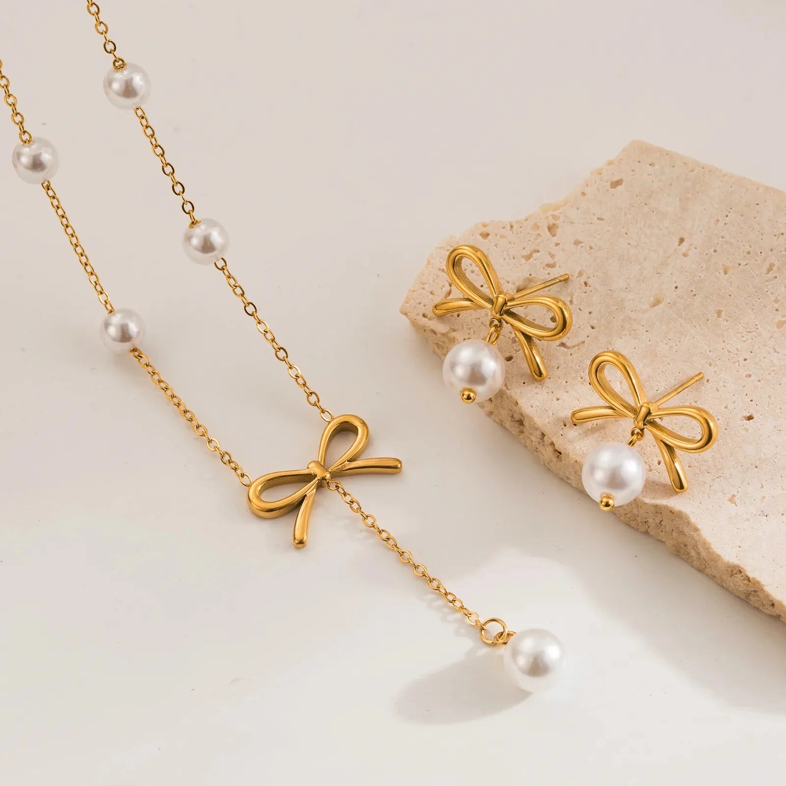 Get tied up in style with our Pearl Bow Know Jewelry Set. Made from waterproof high-quality stainless steel, this 2-piece set adds a touch of sophistication to any outfit. Perfect for everyday wear or special occasions, it's the ultimate accessory for the fashion-forward individual. (Don't worry, it won't get tied in knots.)