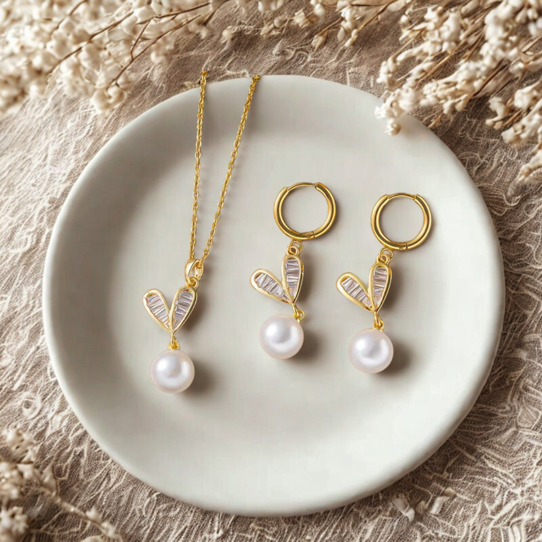 Fall in love with this precious Pearl Heart Jewelry Set! The gold heart necklace and earrings complemented by a shimmering pearl add a touch of elegance to any outfit. Made of stainless steel, this set is also waterproof for long-lasting wear. Perfect for everyday wear or special occasions. Truly a gem (pun intended)!