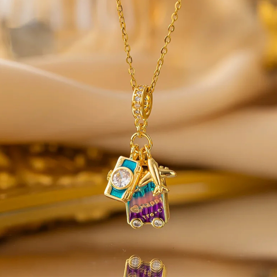 Add a touch of adventure to your style with this gold stainless steel travel necklace. Durable and chic, it’s perfect for those on the go who want to keep a little sparkle close by. Whether exploring new cities or just daydreaming about your next trip, this necklace is your playful companion for every journey.