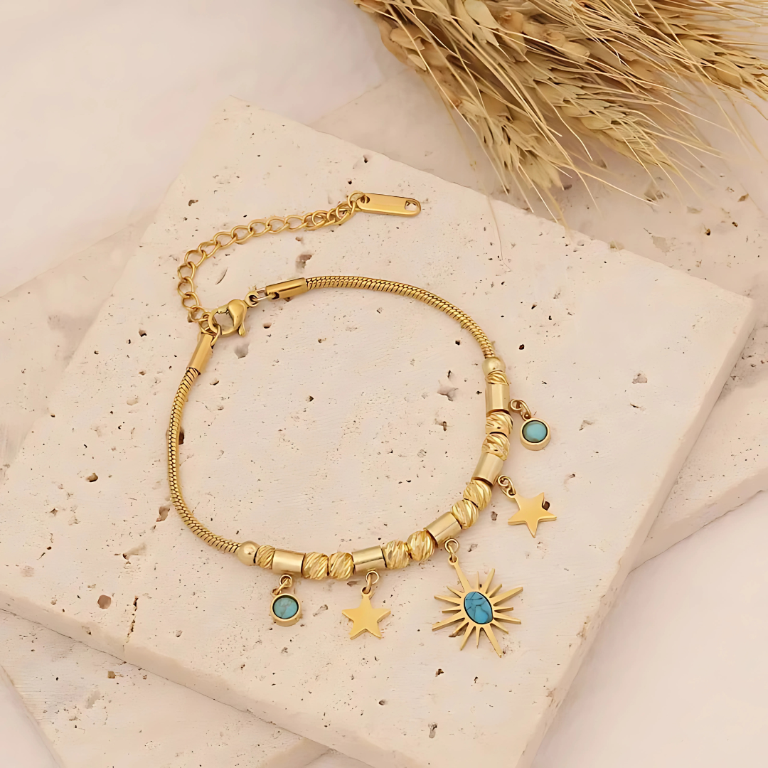 Add a splash of color and sparkle to your wrist with this playful turquoise bracelet! Crafted from durable stainless steel and finished with a luxurious 18k gold bath, it combines vibrant turquoise hues with a chic golden shine. Perfect for brightening up any outfit, this bracelet is both stylish and sturdy—ready to keep up with your fun, lively spirit.