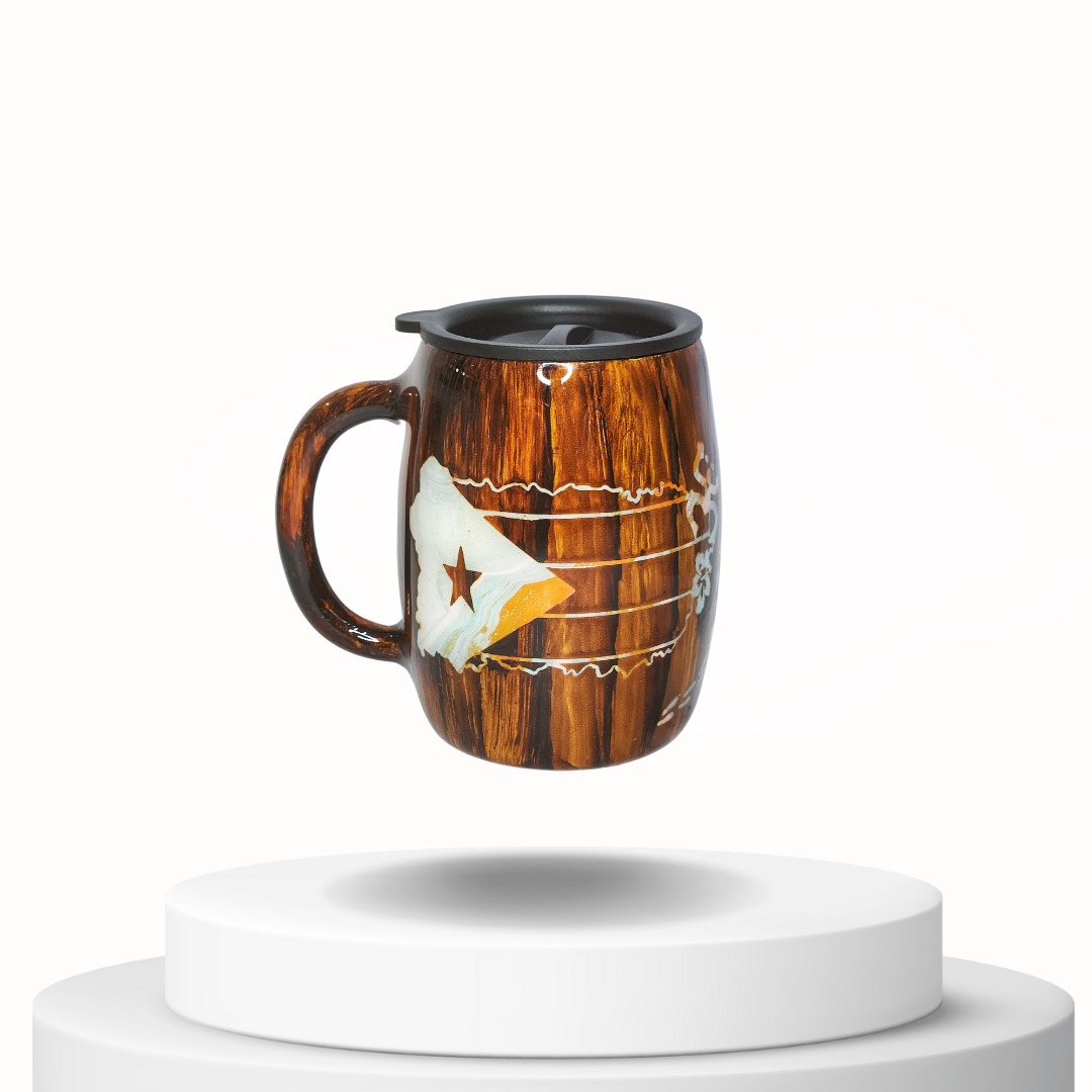 Hermoso vaso trabajado a mano simulado madera y personalizado nuestra bandera de Puerto Rico. Perfecto para tus rutinas diarias. Mantenga la temperatura de su bebida por más tiempo.
