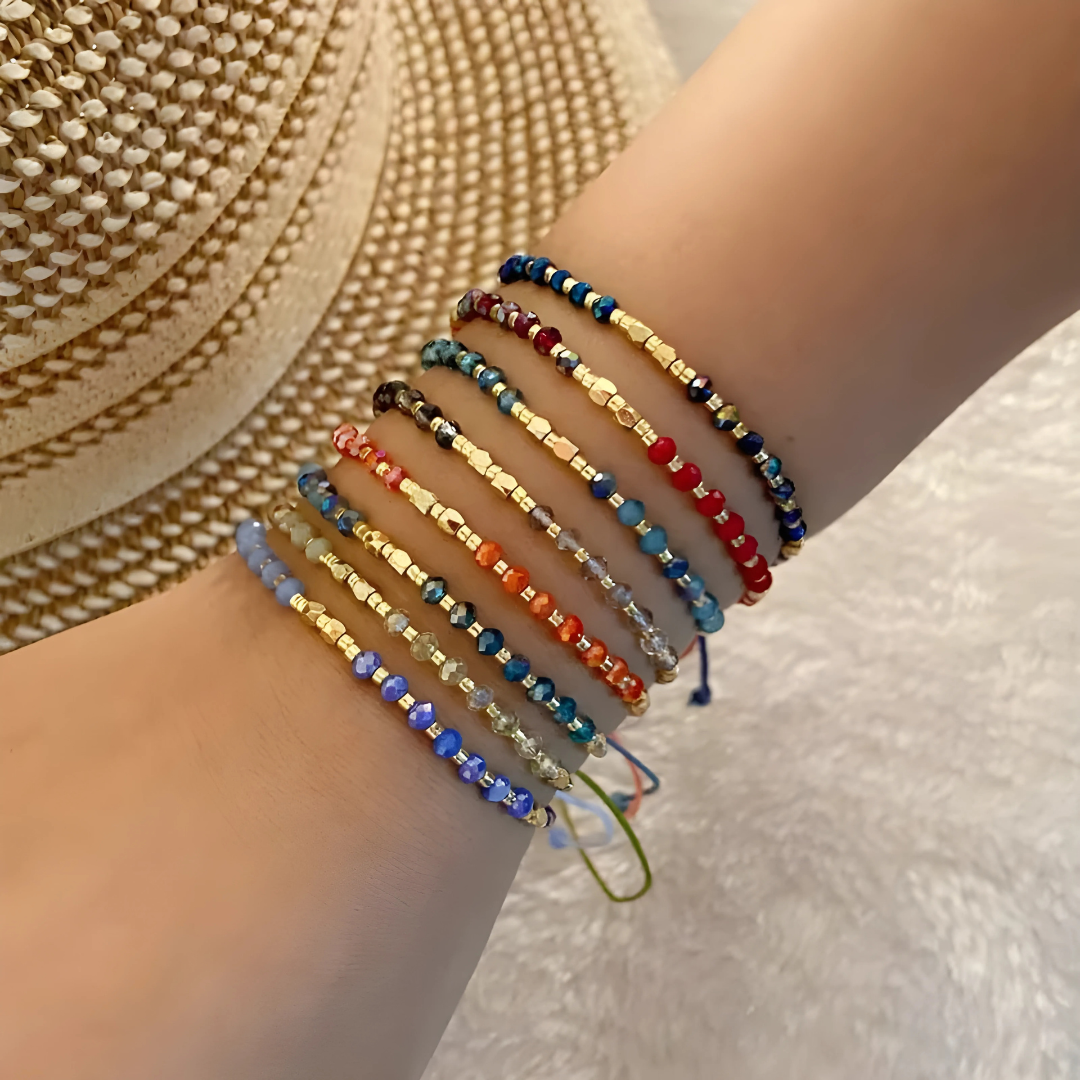 Embrace your inner adventurer with the Wanderlust Bracelet, featuring magical fantasy pearls woven into a vibrant string base. Available in a spectrum of colors, this boho-inspired accessory adds a playful pop to any outfit, perfect for those who love to express their carefree spirit and unique style wherever they go.